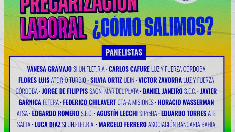 Coordinará el encuentro Gabriel Galeano de UEJN y entre los panelistas que participarán del conservatorio estarán presentes Vanesa Gramajo y Luca Díaz de SI.UN.FLET.R.A, Carlos Cafure y Víctor Zavorra de LUZ y FUERZA de Córdoba, Luis Flores de ATE Rio Turbio, Silvia Ortiz de UEJN, Jorge de Filippis de SAON Mar del Plata, Daniel Janeiro y Edgardo Romero del SEC, Javier Garnica de FETERA, Federico Chilavert de la CTA Autónoma de Misiones, Horacio Wasserman de ATSA, Agustín Lecchi de SIPREBA, Eduardo Torres de ATE Salta, Marcelo Ferrero de la Asociación Bancaria Bahía Blanca y Nico Huinca delegado de la Uocra Bahía Blanca.