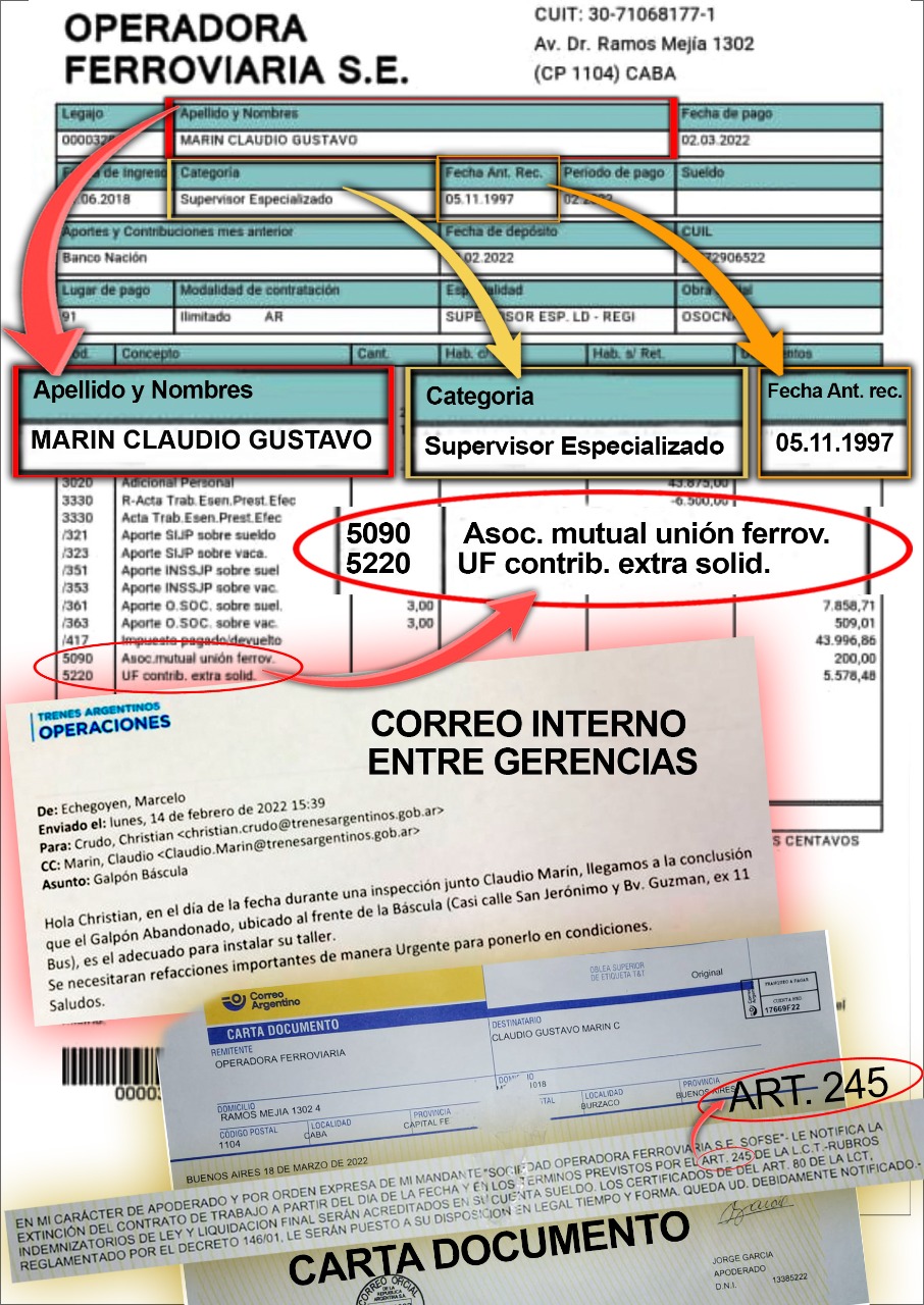 En ese sentido el texto señala que Marín "es victima de una trampa patronal de algún funcionario" dado que la empresa le solicitó que realice un relevamiento del estado de las estaciones. "Dentro de las funciones de nuestro compañero, se encontraba la puesta en valor de estaciones etc., para eso era necesario contar en algún momento con un taller de obras civiles, el cual en la zona no existe. Por ende, la empresa le otorga un espacio, un edificio abandonado. El compañero Marín una vez informado repara la puerta y solicita un candado a la empresa, el cual es concedido" Luego de esto sobrevino el despido por parte de SOFSE