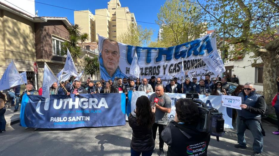 La protesta de los trabajadores y miembros de la Unión de Trabajadores Hoteleros y Gastronómicos de la República Argentina (Uthgra) se hizo frente a la sede de la Asociación Hotelera y Gastronómica (AEHG), ubicada en Santa Fe al 1800.