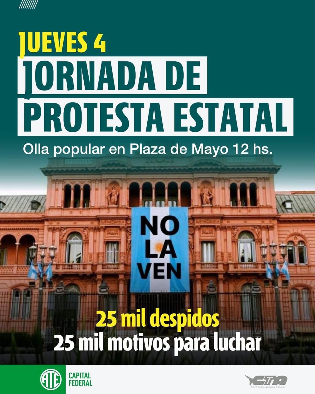La Asociación de Trabajadores y Trabajadoras del Estado (ATE) ha convocado a una olla popular en la Plaza de Mayo hoy 4 de julio a las 12 horas, en defensa del Estado Nacional y en rechazo a los más de 25000 despidos ejecutados por el gobierno nacional