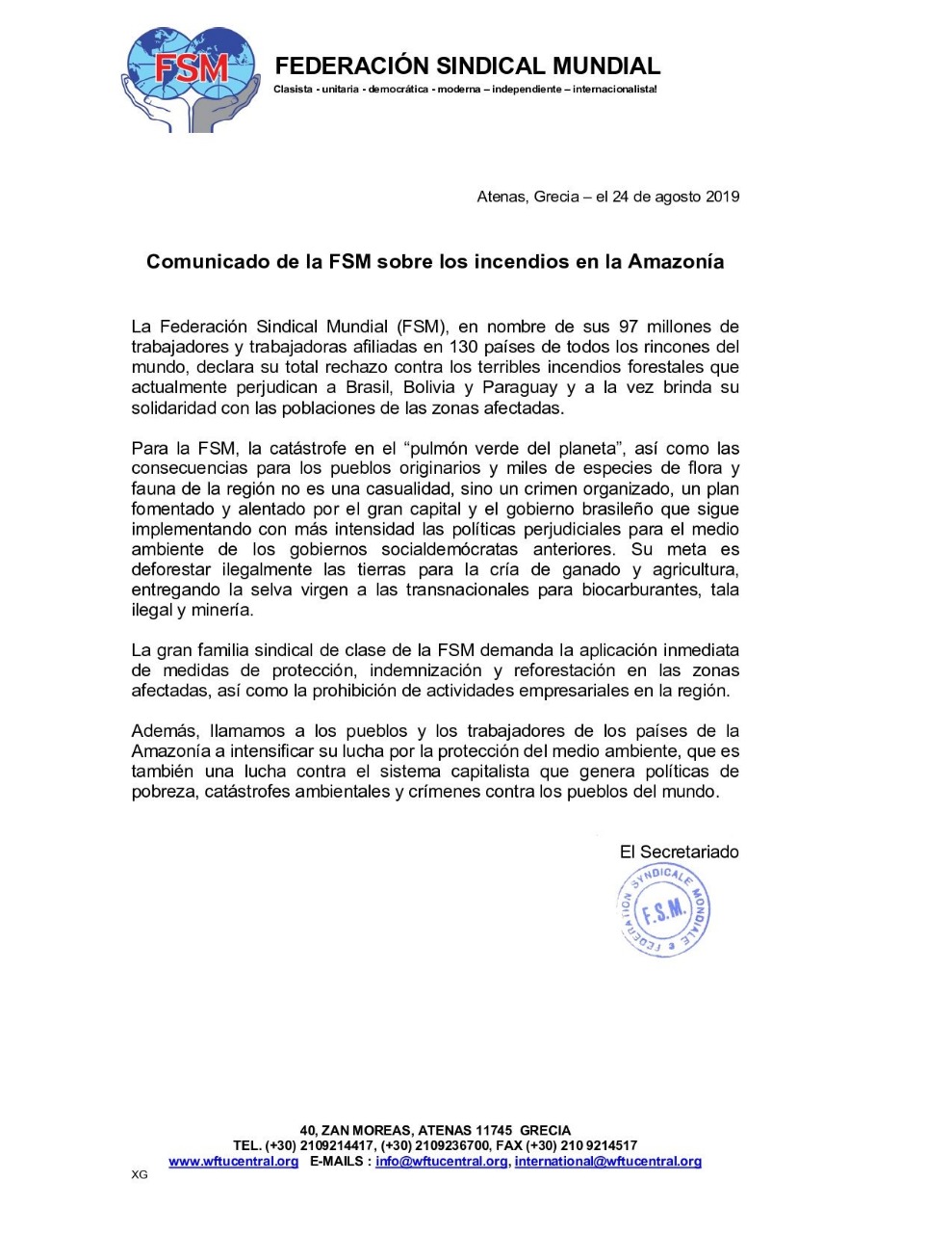 La Federación Sindical Mundial (FSM) emitió un comunicado en el que "declara su total rechazo contra los terribles incendios forestales que actualmente perjudican a Brasil, Bolivia y Paraguay y a la vez brinda su solidaridad con las poblaciones de las zonas aledañas".