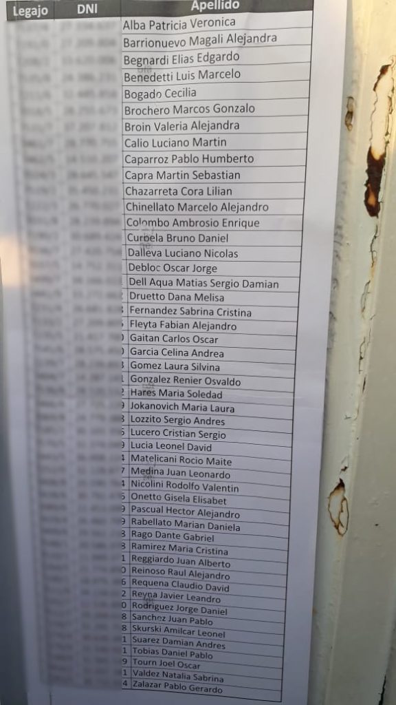 Fabricaciones Militares de Río Tercero, Córdoba, viernes 17 de agosto. Así se fueron enterando los trabajadores de sus propios despidos. Fue la dependencia con mayor cantidad de cesantías. Gendarmería estaba apostada en la puerta de la fábrica.