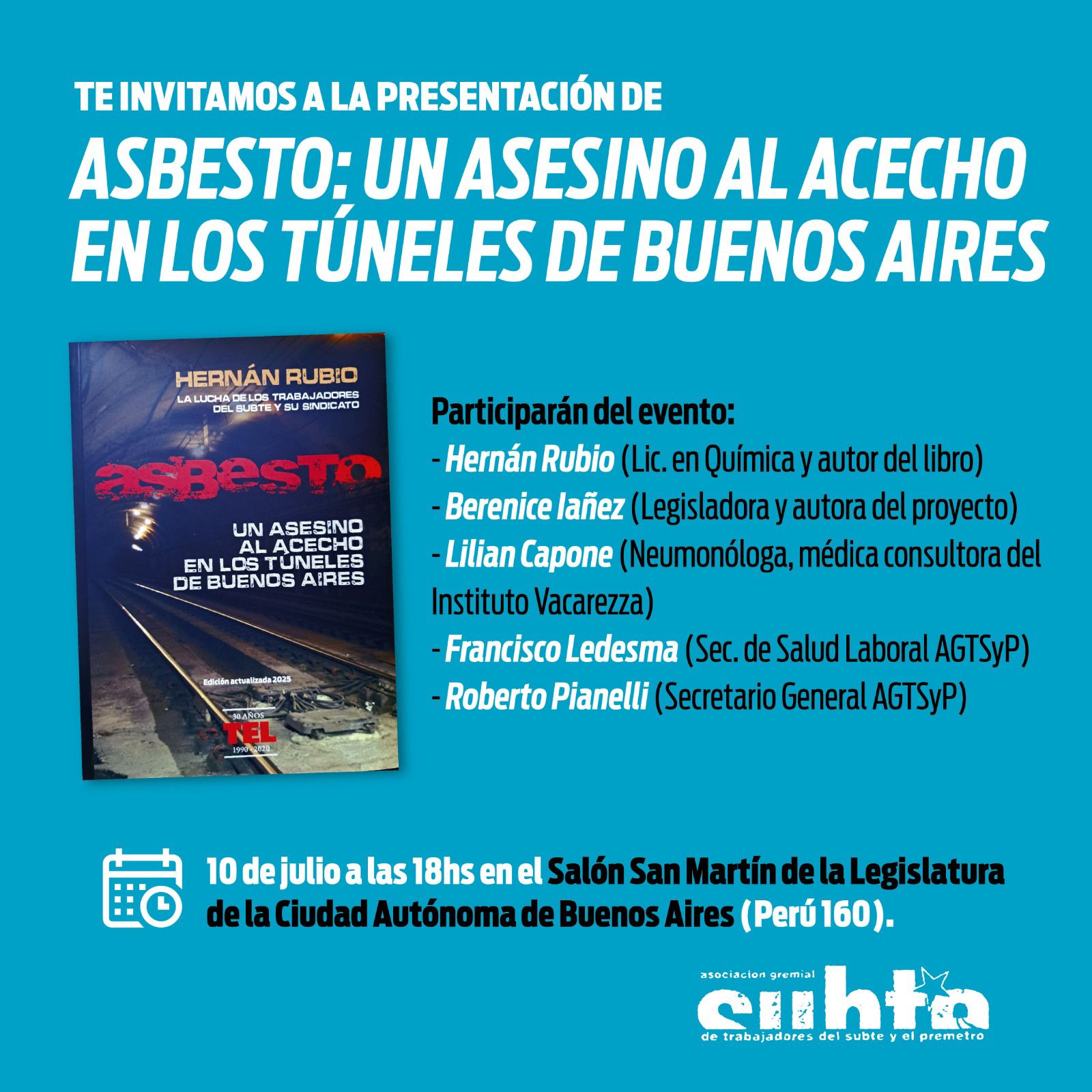 Este jueves 10 de julio a las 18 horas, en el Salón San Martín de la Legislatura porteña (Perú 160), se presentará el libro “Asbesto: un asesino al acecho en los túneles de Buenos Aires”, del licenciado en Química Hernán Rubio, una obra clave para comprender el impacto del asbesto en la salud de trabajadores y usuarios del subte.