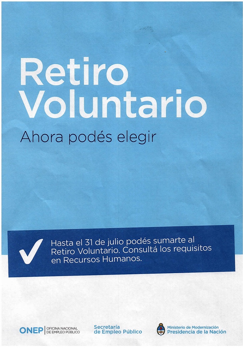 Los empleados del ministerio de Educación de la Nación recibieron un correo electrónico institucional que invitaba a sumarse al retiro voluntario mediante un flyer con la leyenda "Ahora podés elegir" y “hasta el 31 de julio tenés tiempo de sumarte”. La “promoción” no contaba con aclaración de ningún tipo, y tampoco estaba acompañada de alguna resolución que oficializara la propuesta.