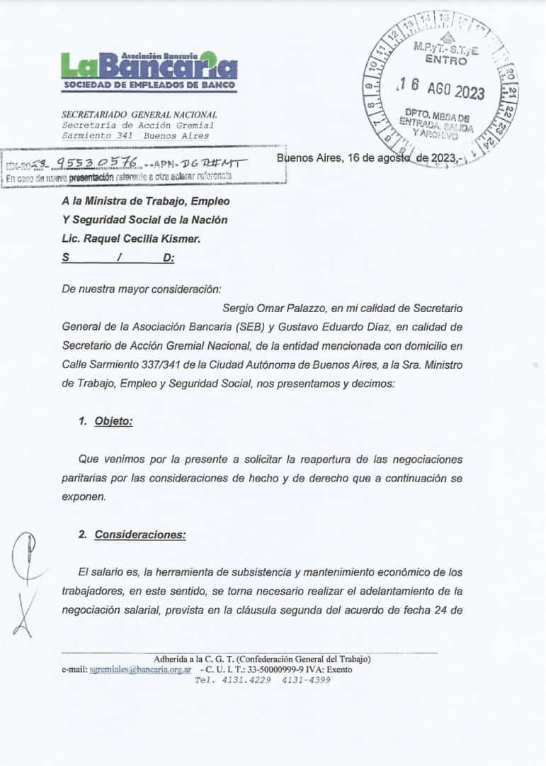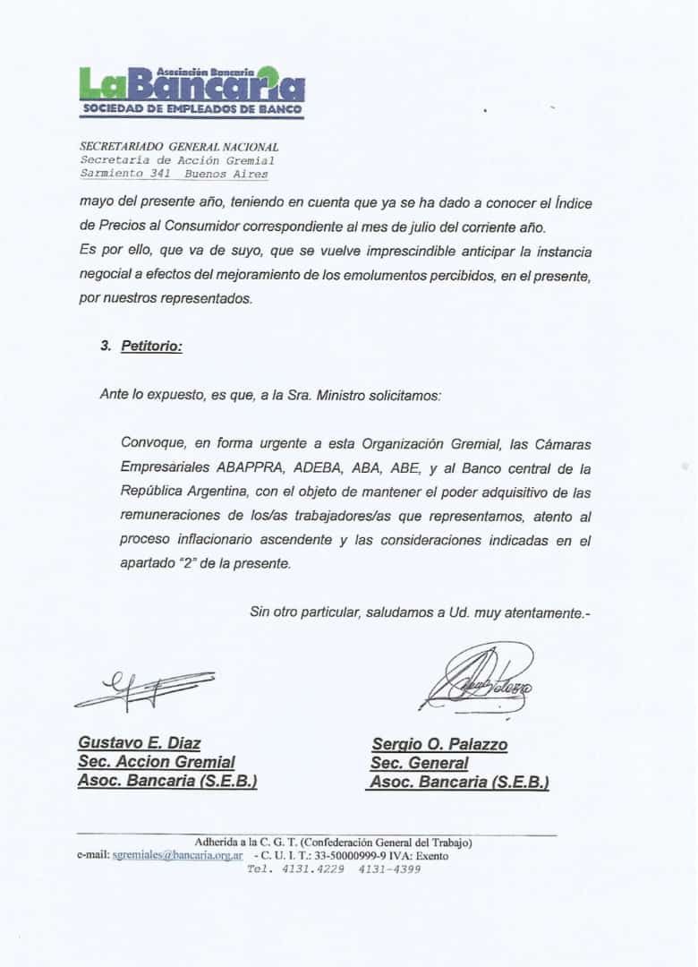 A través de Palazzo y el secretario de Acción Gremial del sindicato, Gustavo Díaz, la Bancaria solicitó en una nota a la ministra de Trabajo, Raquel Olmos, "la reapertura de las negociaciones paritarias, porque el salario es la herramienta de subsistencia y mantenimiento económico de los trabajadores".
