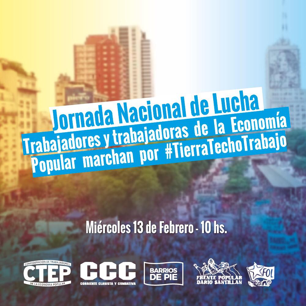 Los movimientos sociales pertenecientes a la CCC, la CTEP, Barrios de Pie, Frente Popular Darío Santillán y el FOL, junto a otras organizaciones sociales y sindicales realizarán el 13 de febrero una Jornada Nacional de Lucha contra el hambre y los tarifazos.