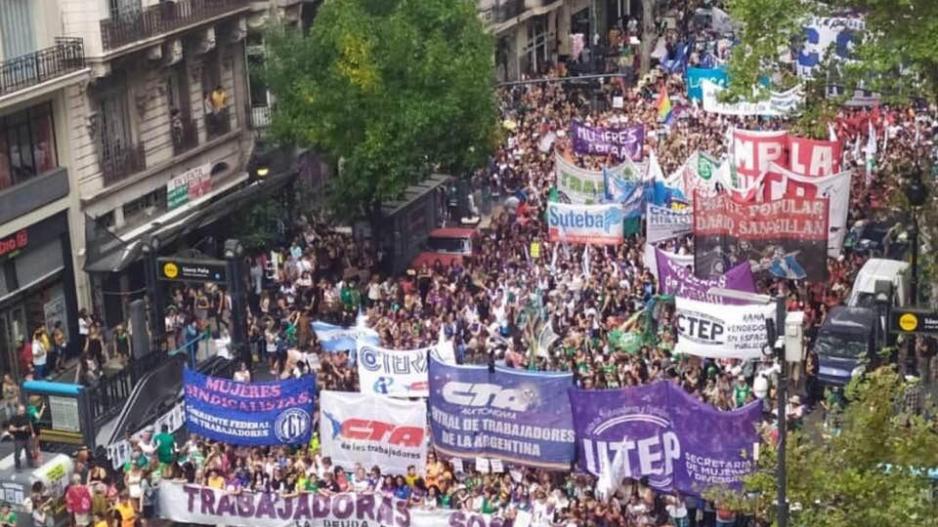 Al finalizar la lectura del documento colectivo, se mencionaron más de cien adhesiones de sindicatos, organizaciones sociales, políticas, estudiantiles y feministas y se gritó: “Celebramos que el feminismo es revolución y, con más fuerza que nunca, que hoy volvemos a estar juntas y juntes para que resuene en todo el mundo: La deuda es con nosotras y nosotres, ni con el FMI ni con las iglesias”.