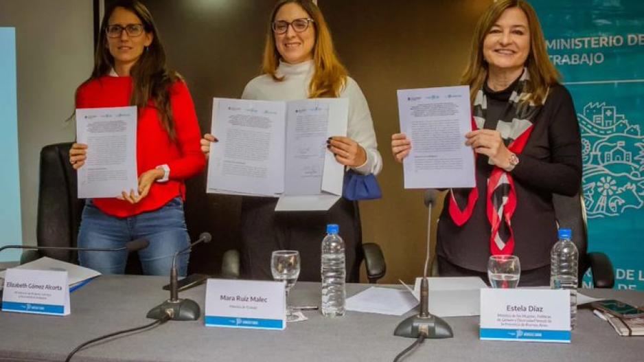 Las ministras de las Mujeres, Géneros y Diversidad de la Nación, Elizabeth Gómez Alcorta, de las Mujeres, Políticas de Género y Diversidad Sexual de la provincia de Buenos Aires, Estela Díaz; y de Trabajo de la provincia de Buenos Aires, Mara Ruiz Malec, firmaron el convenio para llevar adelante el Sello Igualar Oficios, que busca el enfoque de igualdad de género en los centros de formación laboral (CFL) para revertir la división sexual del trabajo.