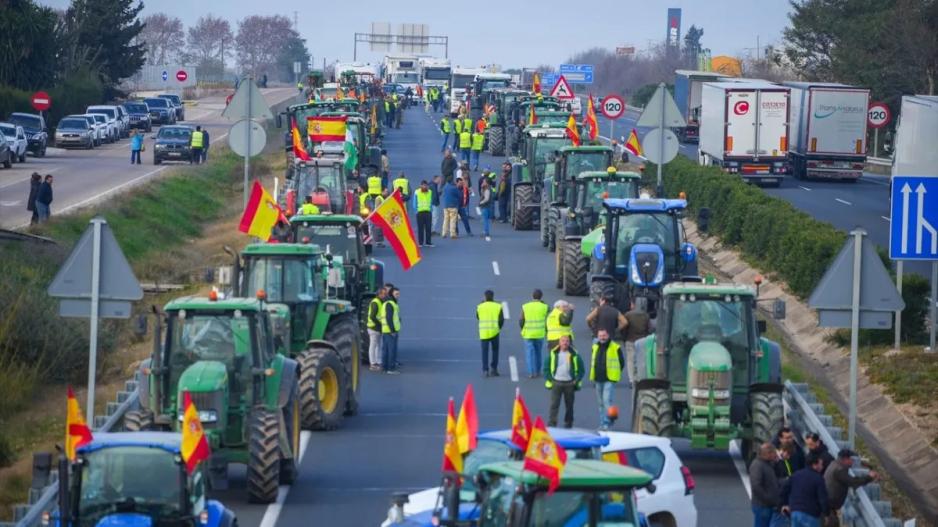 También hubo bloqueos para ingresar al puerto de Málaga, en el sur, mientras que en Madrid, alrededor de 100 tractores cortaron una de las arterias principales que une la capital con ciudades cercanas, como Toledo y Ávila.