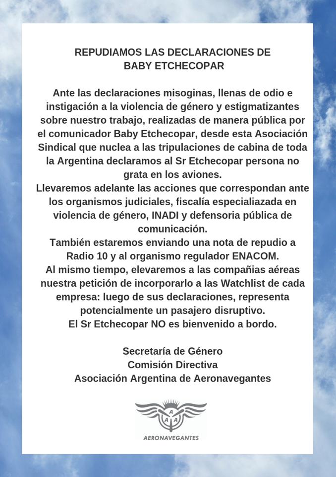 Por su parte, la AAA le respondió que "desde Aeronavegantes repudiamos las declaraciones de Baby Etchecopar, y llevaremos adelante las acciones que correspondan ante organismos judiciales, fiscalía especializada en violencia de género, Inadi y la Defensoría Pública de comunicación". Como corolario de su respuesta, el sindicato lo declaró "al Sr. Etchecopar persona no grata en los aviones".
