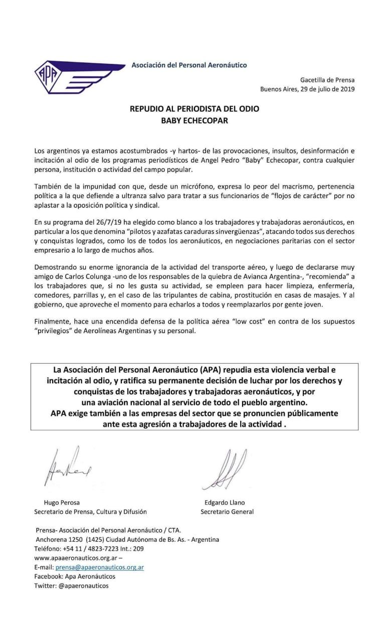 La Asociación del Personal Aeronáutico (APA) y la Asociación Argentina de Aeronavegantes (AAA), que reúne al personal de cabina, repudiaron mediante sendos comunicados las declaraciones que el conductor radial Ángel Pedro Etchecopar, más conocido como Baby, hizo en su programa de Radio 10 contra pilotos, azafatas y trabajadores de Aerolíneas Argentinas.