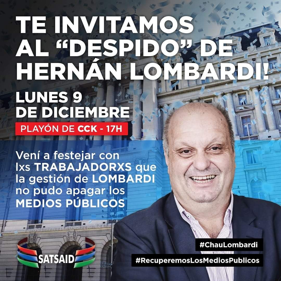 Con un "Chau Lombardi, hasta nunca" decidieron despedir a las 17hs en el Playón del Centro Cultural Néstor Kirchner a quien desde que asumió como titular del Sistema de Medios Públicos "su política tuvo una sola orientación: Su destrucción".
