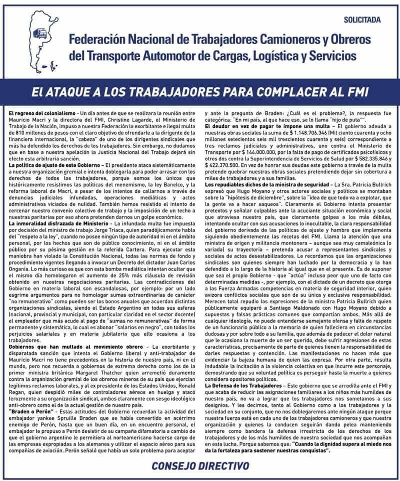 Desde el gremio de Camioneros, salieron rápidamente a contestar la embestida gubernamental, asegurando que "el presidente Macri, ataca sistemáticamente a nuestra organización gremial e intenta doblegarla para poder arrasar con los derechos de todos los trabajadores, porque somos los únicos que históricamente resistimos las políticas del menemismo, la ley banelco y la reforma laboral de Macri...". Además, señalan que " la infundada multa fue puesta por decisión del ministro de trabajo, Jorge triaca, quien paradójicamente habla de "respeto a la ley", cuando no poseé ningún tipo de autoridad ni en el ámbito personal, por los hechos que son de público conocimiento, ni en el ámbito público, por su pésima gestión en la referida cartera. Para ejecutar esta maniobra han violado la Constitución Nacional, todas las normas de fondo y procedimientos vigentes, llegando a invocar un decreto del dictador, Juan Carlos Onganía." Advirtiendo que "lo más curioso es que con esta bomba mediática intentan ocultar que el mismo día homologaron el aumento de 25% más cláusula de revisión obtenida en nuestras negociaciones paritarias."
