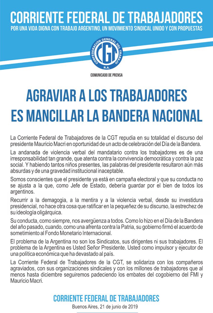La Corriente Federal de la CGT, que lidera Sergio Palazzo secretario general de La Bancaria, emitió un comunicado repudiando el discurso del presidente Mauricio Macri en el Día de la Bandera, y lo acusa de ser el responsable de "una política que ha devastado al país".
