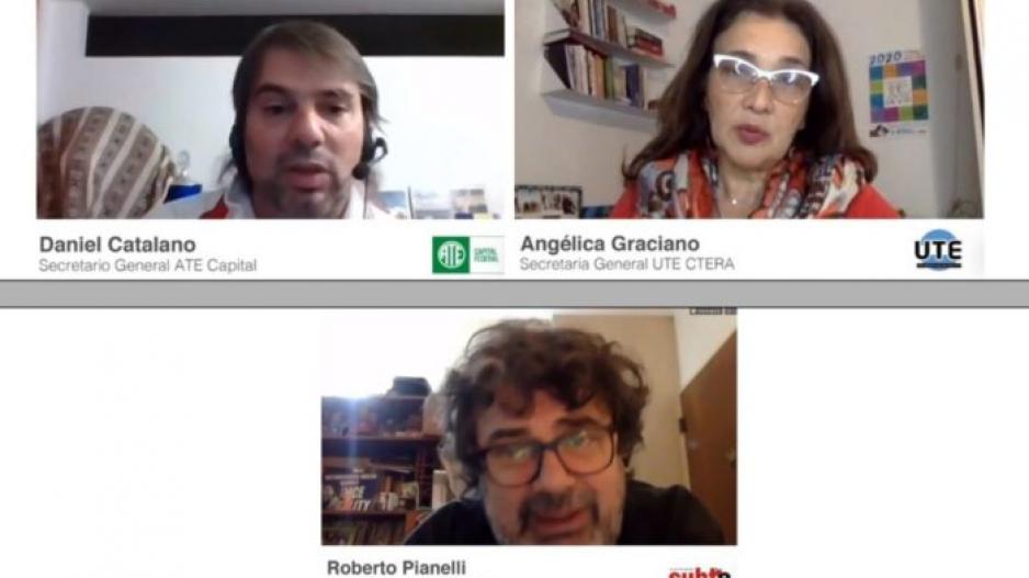 De la videoconferencia participaron, Daniel Catalano, secretario general de ATE-Capital, Angélica Graciano, secretaria general de UTE y Roberto Pianelli, secretario general de la AGTSyP donde cuestionaron duramente aHoracio Rodríguez Larreta, jefe de gobierno porteño por la gestión de la crisis sanitaria en el marco de una política sistemática de reducción de la inversión en salud, educación y áreas sociales.