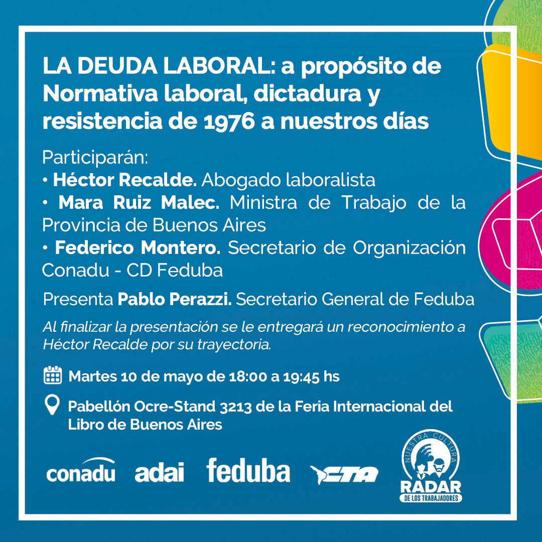 La charla estará coordinada por Pablo Perazzi (Secretario General de Feduba) y se realizará este martes 10 de mayo a las 18 hs en el stand de Radar Intersindical de Cultura. Pabellón Ocre-Stand 3213