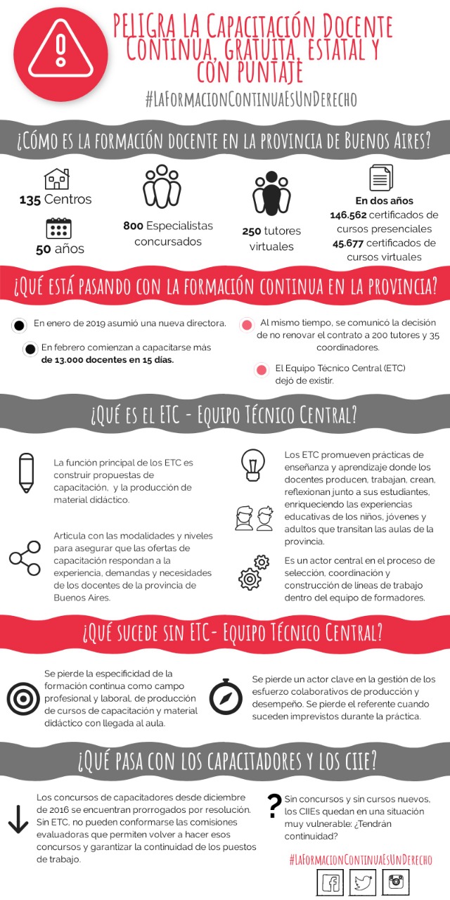 Finalizan convocando a la comunidad educativa a defender el derecho a la formación docente estatal, gratuita y de calidad académica, recuerdan que la capacitación docente es un requisito para el acceso a los cargos docentes, por ende, el Estado es quien debe garantizarla, solicitan además que se expliciten los motivos de la decisión de eliminar los ETC y los tutores virtuales para conocer cuál es el plan de Formación Continua y Capacitación que tienen planificado, piden también la reincorporación de los ETC, la continuidad de los ETR y del funcionamiento habitual de los CIIEs y el sostenimiento de las ofertas de capacitación estatales