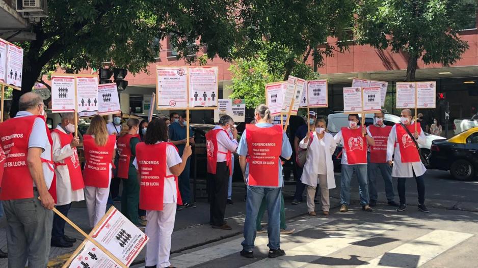 Denunció, además, que las autoridades del Hospital Italiano "vienen ejecutando un plan sistemático de violencia institucional" que consiste en "negarles la relación de dependencia a miles de médicos" y aplicarle al plantel del centro de salud "una reducción de hasta el 50% en los ingresos", aduciendo la "baja en las ganancias anuales de la empresa".