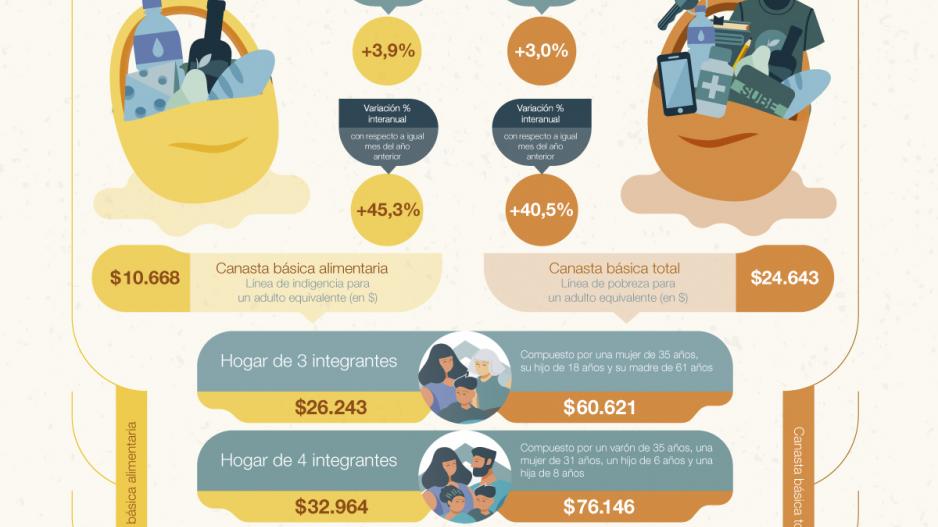 En tanto, el costo de la canasta básica total (CBT) marcó un avance de 40,5% durante 2021, con lo cual el mismo grupo familiar necesitó percibir $76.146,13 para poder abonar alimentación y servicios básicos y no caer debajo de la línea de la pobreza.