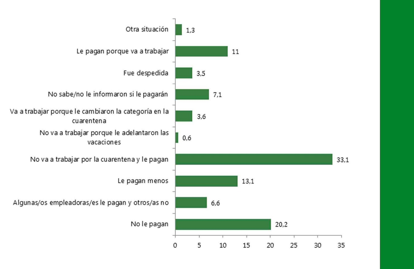 El relevamiento dio cuenta de una serie situaciones críticas en relación a la situación laboral de estas trabajadoras: entre 5 y 6 de cada 10 trabajadoras encuestadas (56%) empeoró su situación laboral a partir del aislamiento social preventivo y obligatorio. Las formas en que se vio afectada su situación laboral son diversas: despidos, reducción salarial, falta de pago de salario, vacaciones anticipadas, cambios de categoría, etc. (ver gráfico)