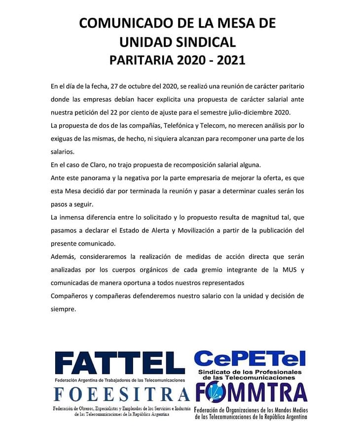 El comunicado fue firmado por la Federación Argentina de Trabajadores de las Telecomunicaciones (FATTEL), el Sindicato de los Profesionales de las Telecomunicaciones (CePETel), la Federación de Obreros, Esppecialistas y Empleados de los Servicios e industria de las Teñecomunicacoines (FOEESITRA) y la Federación de Orgabizaciones de los Mandos Medios de las Telecomunicaciones de la República Argentina (FOMMTRA)