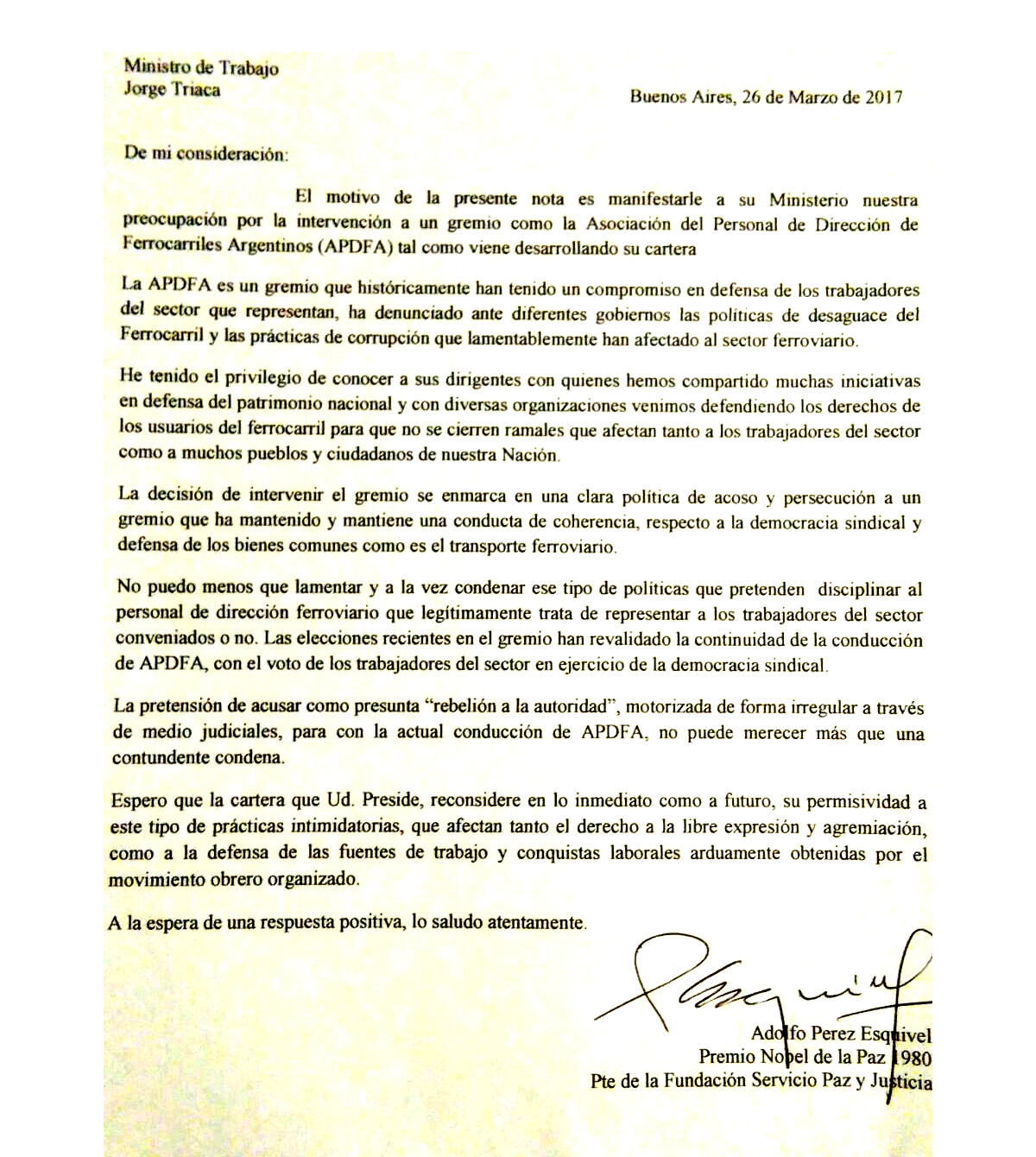 Mediante una carta dirigida al ministro de Trabajo Jorge Triaca, el premio Nobel de la Paz Adolfo Pérez Esquivel manifestó su preocupación y la de otros dirigentes sociales por la intervención al sindicato del personal de dirección de ferrocariles argentinos, APDFA.