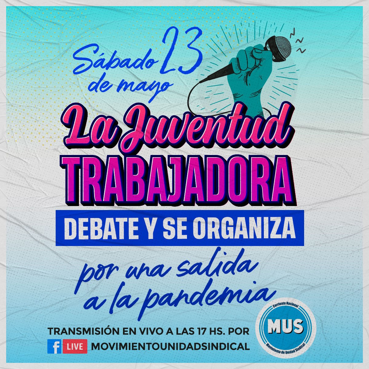 La transmisión en vivo, titulada “La Juventud Trabajadora Debate y se Organiza, por una salida a la pandemia”, se realizará a través del Facebook Live del *Movimiento de Unidad Sindical (MUS) este sábado 23 de mayo a las 17.00hs.