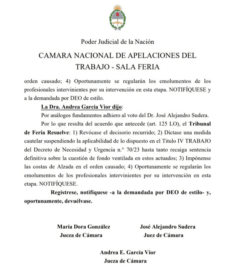 "Díctase una medida cautelar suspendiendo la aplicabilidad de lo dispuesto en el Titulo IV Trabajo del Decreto de Necesidad y Urgencia 70/2023 hasta tanto recaiga sentencia definitiva sobre la cuestión de fondo ventilada en estos actuados", decidieron los jueces por mayoría.