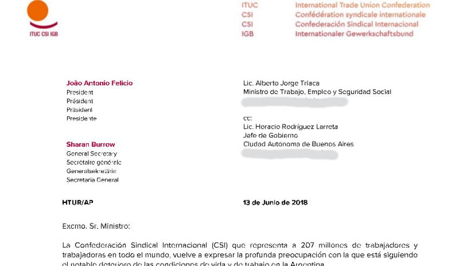 Mediante un documento dirigido explícitamente al ministro de Trabajo de la Nación, Jorge Triaca, y con copia al Jefe de Gobierno porteño, Horacio Rodríguez Larreta, la Confederación Sindical Internacional (CSI) expresa la "profunda preocupación con la que está siguiendo el notable deterioro de las condiciones de vida y de trabajo en Argentina".