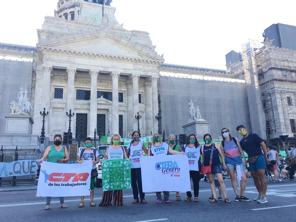 Desde la CTA-T celebraron el dictamen positivo al proyecto Ley de Interrupción Voluntaria del Embarazo que se tratará el 29 de diciembre en el Senado y participaron del pañuelazo en las inmediaciones del Congreso, con las consignas “Justicia social es poder decidir” y “Es ahora Senado”,