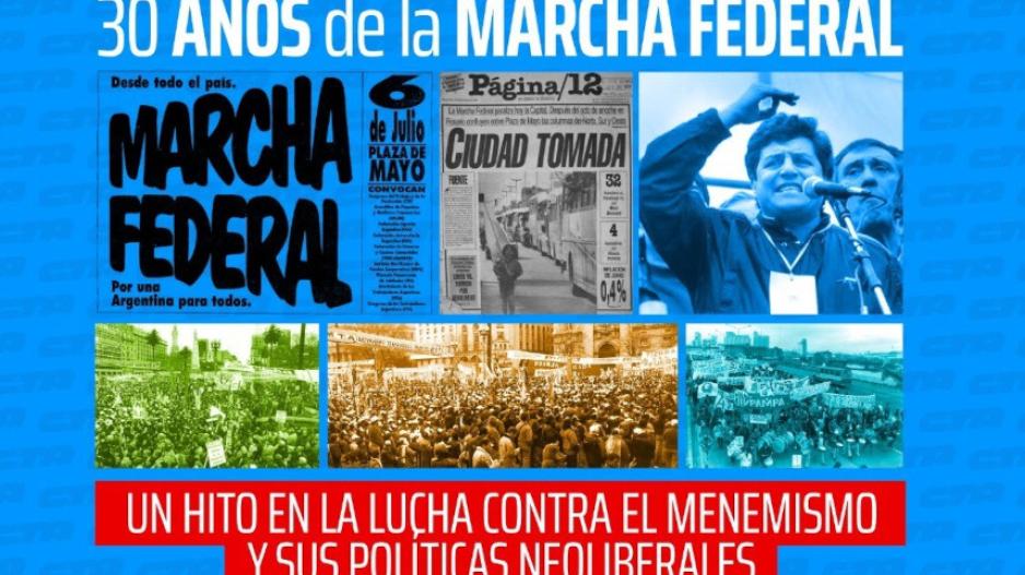 Hugo "Cachorro" Godoy, Secretario General de la CTA Autónoma, fue uno de los principales oradores del evento. “Esta noche celebramos en nuestra CTA los 30 años de la Marcha Federal, aquel hito de lucha del movimiento popular, de los trabajadores y trabajadoras, de artistas, de nuestras Madres de Plaza de Mayo; en esa historia nos miramos y nos proyectamos”, declaró Godoy. Además, señaló: “En estos tiempos en que vivimos horas nefastas, de entrega y sumisión, éste es un merecido reconocimiento a todos y todas quienes protagonizaron aquella epopeya, pero también es la reafirmación de la unidad del campo popular, porque pudimos enfrentar a la dictadura, enfrentamos la traición, y ahora también lo vamos a poder hacer con este gobierno”.