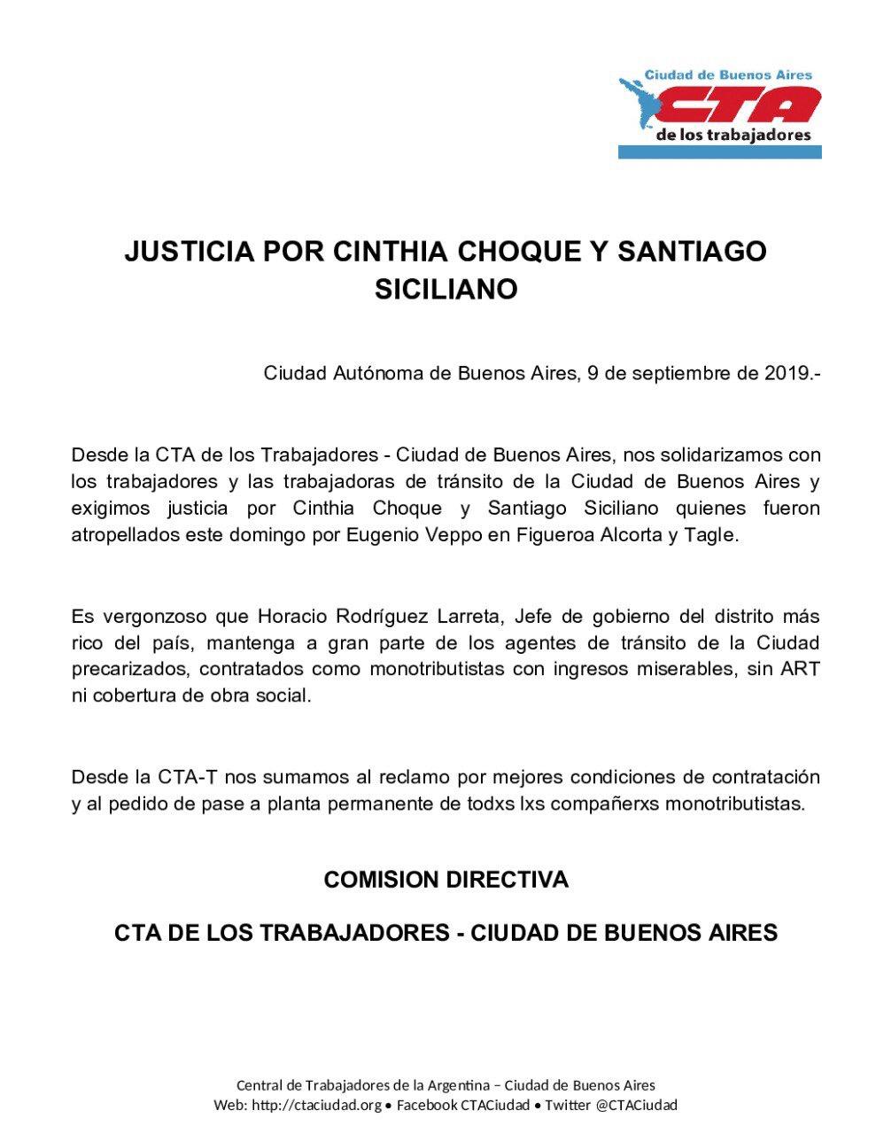 La CTA de los Trabajadores dijo al respecto que "los trabajadores de ese sector son monotributistas y no tienen cobertura ART, ni obra social. Ayer por la noche y hoy por la mañana, reclamaron en el Obelisco por la falta de protección laboral que padecen y exigieron justicia para sus colegas atropellados. Acompañamos el reclamo de lxs trabajadores y familiares de Cinthia y Santiago y exigimos una respuesta inmediata por parte del gobierno de Horacio Rodríguez Larreta".