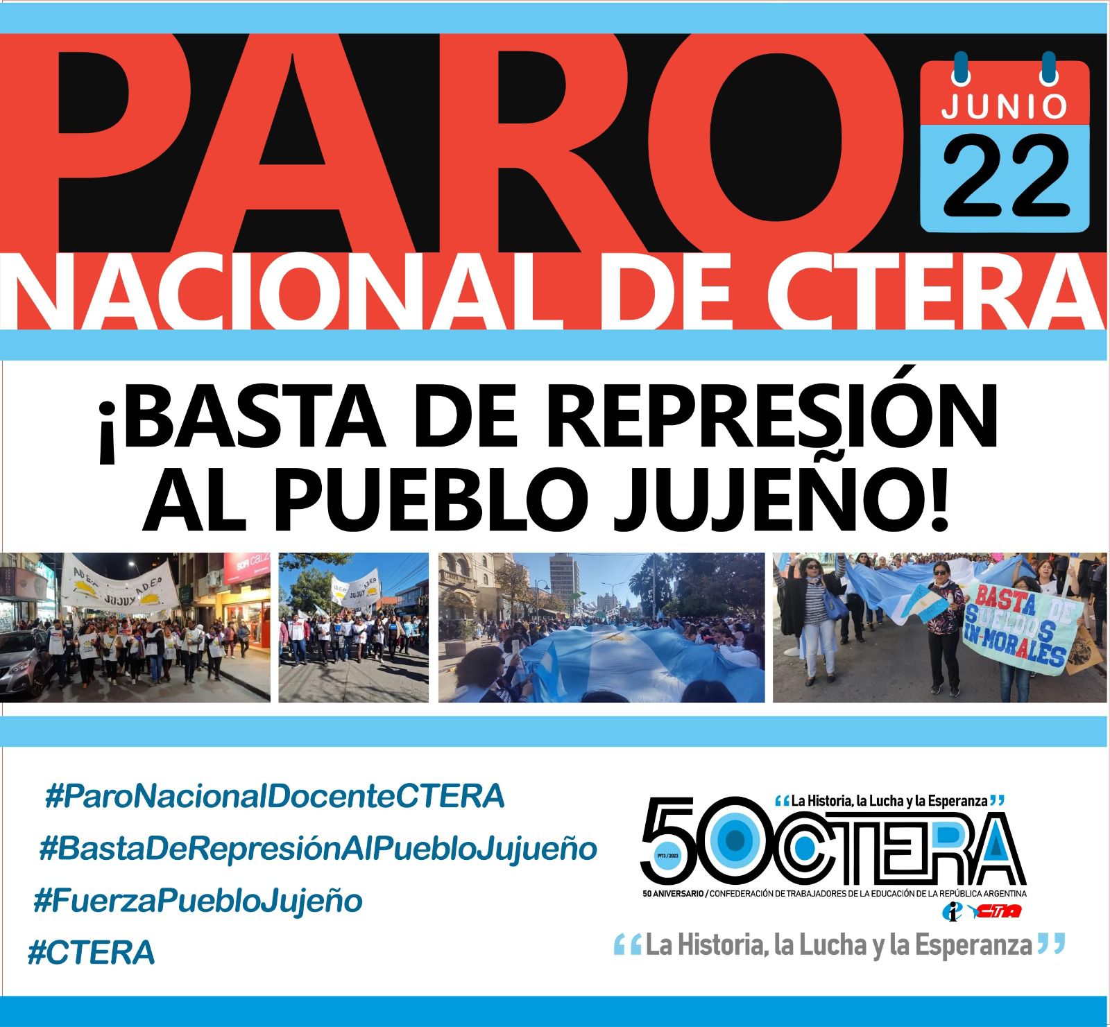 La Confederación de Trabajadores de la Educación (Ctera) convocó a un paro nacional docente para el próximo jueves 22 de junio, tras la represión policial desplegada por el gobierno de Gerardo Morales en Jujuy contra manifestantes que reclamaban por la reforma de la Constitución de esa provincia.