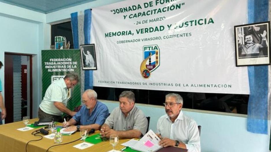 El secretario general de la FTIA, Héctor Morcillo, y el adjunto, Rodolfo Daer, junto a los miembros titulares de la conducción nacional Ricardo Bertero y Daniel Sequeira, encabezaron un encuentro junto a 35 delegados de todo el país para las deliberaciones del secretariado nacional y una jornada dedicada a la reivindicación democrática por el aniversario del golpe de Estado de 1976 y la construcción de memoria.