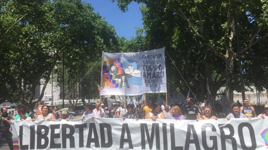 Con pancartas que rezaban el pedido de "Libertad a Milagro" y "Fuerza Milagro", los activistas llegaron hasta el sanatorio "Los Lapachos" de San Salvador de Jujuy, en una clara muestra de apoyo a la líder de la Tupac Amaru, quien se encuentra internada desde el pasado lunes por una "trombosis venosa profunda".