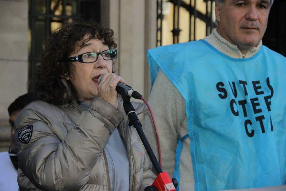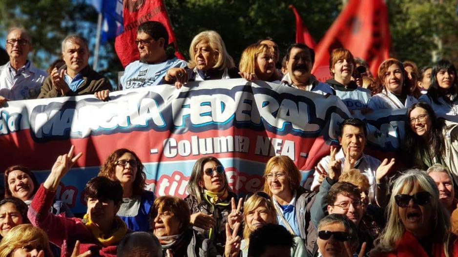 La dirigente de CTERA arengó a la multitud de docentes a marchar "porque exigimos al Gobierno Nacional la convocatoria a la Paritaria Nacional Docente, porque no aceptamos los techos salariales, porque existen conflictos en Chubut, Neuquén, Provincia de Buenos Aires, Chaco, Corrientes, Jujuy, Tierra del Fuego, Santa Cruz y Ciudad de Buenos Aires".