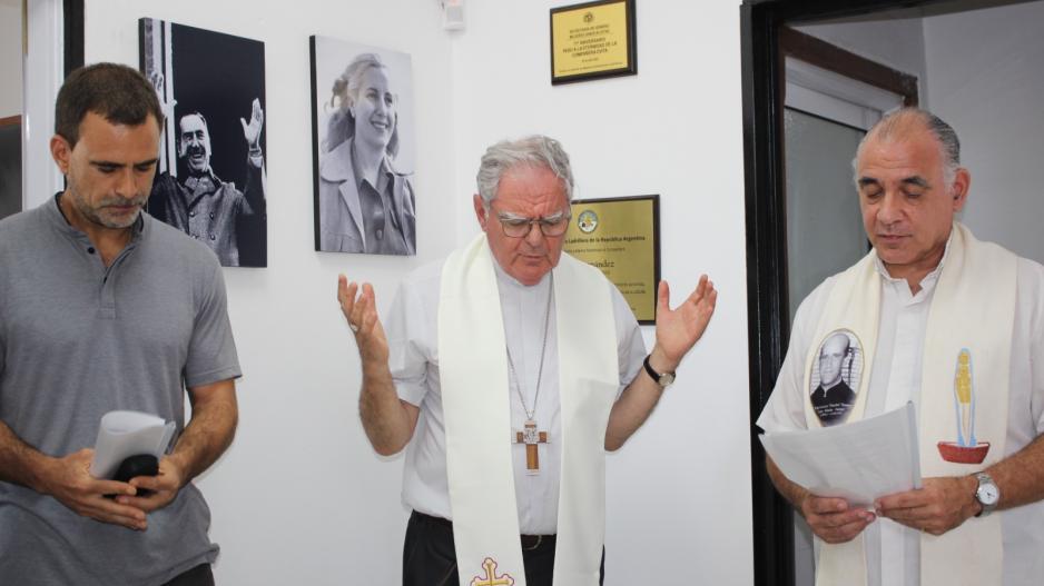 Luego de compartir la ceremonia, el Secretario General de la UOLRA, Luis Cáceres, junto a un grupo de sacerdotes, bendijeron y descubrieron un el cuadro con la imagen del Padre Pancho que está presente en las instalaciones del sindicato.
