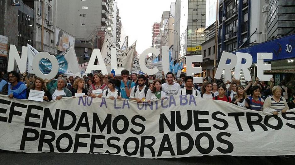 Tanto las organizaciones gremiales de docentes como de estudiantes exigen unánimente el retiro del proyecto elaborado por el ministerio de Educación porteño a cargo de Soledad Acuña, que plantea transferir (y, de hecho, cerrar) los 29 Institutos de Formación Docente terciarios estatales en una nueva casa de estudios que, por ahora, lleva el nombre de UniCABA. De esta manera, no sólo se corre el riesgo de pérdida de puestos de trabajo sino también la propia autonomía de los institutos actuales.