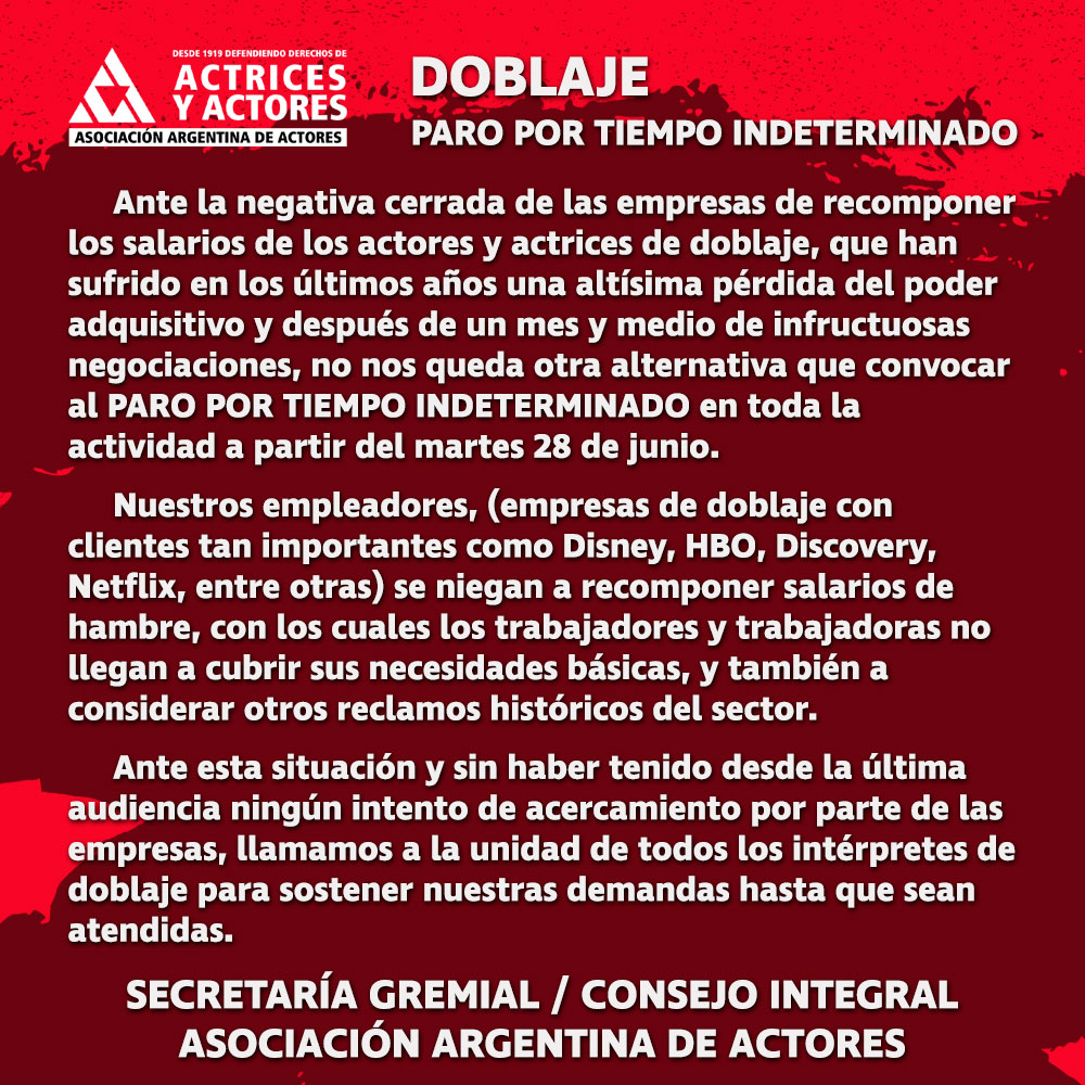 Nuestros empleadores, (empresas de doblaje con clientes tan importantes como Disney, HBO, Discovery, Netflix, entre otras) se niegan a recomponer salarios de hambre, con los cuales los trabajadores y trabajadoras no llegan a cubrir sus necesidades básicas, y también a considerar otros reclamos históricos del sector", denuncian el gremio.