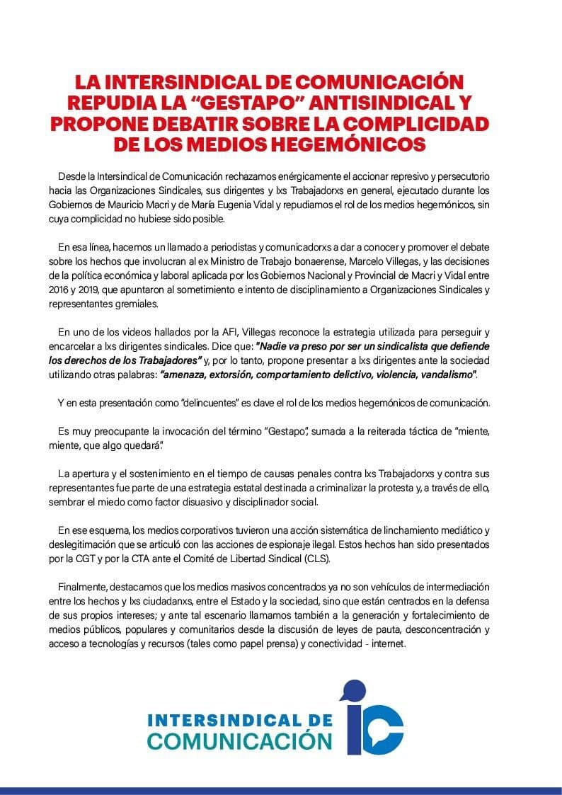Hacemos un llamado a periodistas y comunicadores a dar a conocer y promover el debate sobre los hechos que involucran al ex-Ministro de Trabajo bonaerense, Marcelo Villegas, y las decisiones de la política económica y laboral aplicada por los gobiernos nacional y provincial entre 2016 y 2019 que apuntaron al sometimiento e intento de a organizaciones sindicales y representantes gremiales", afirma el comunicado de la intersindical