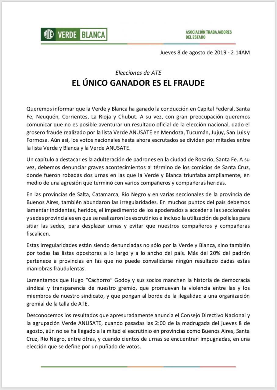El twitt a partir del cual Daniel Catalano hizo circular el comunicado expresa que "Habiendo paridad entre la lista Verde y Blanca y la Verde Anusate en los votos nacionales escrutados, es imposible proclamar a un ganador. A su vez, el #FraudeEnATE ha sido flagrante: estas #EleccionesATE2019 deben ser revisadas".