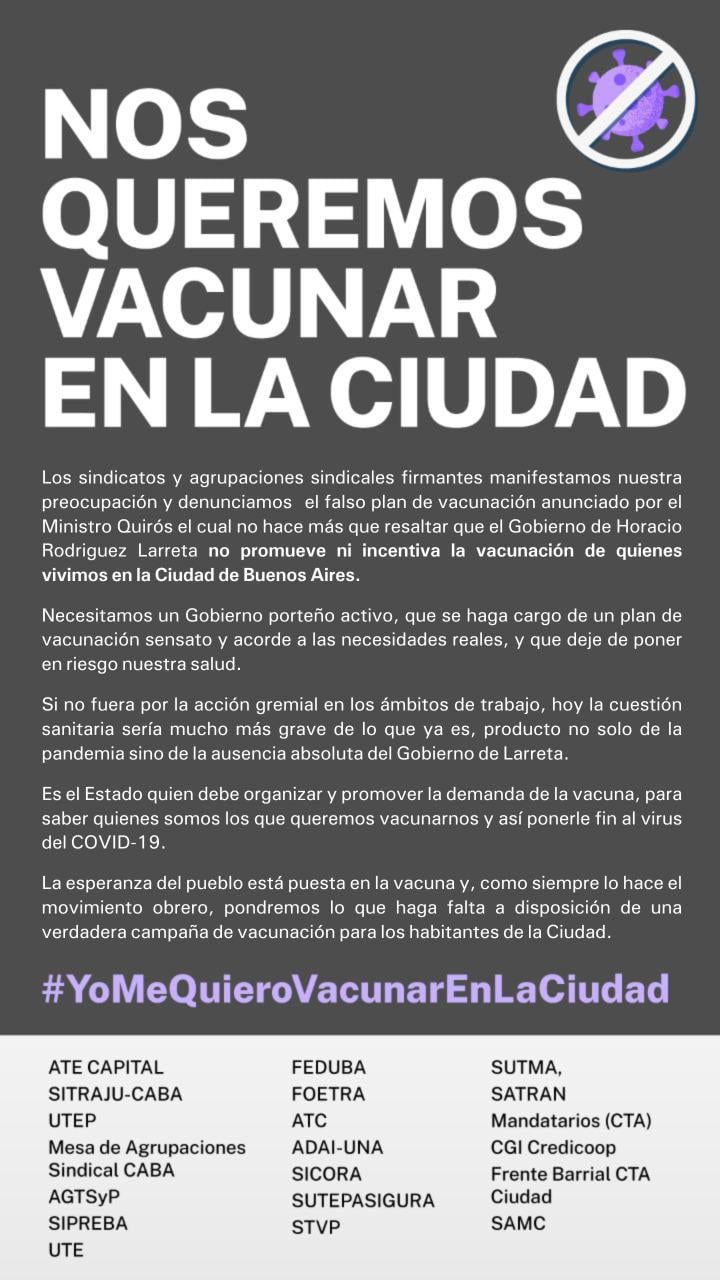 En la nota las entidades gremiales manifiestan su preocupación y denuncian el falso plan de vacunación anunciado por el ministro de salud de la ciudad de Buenos Aires Fernán Quiróz, "el cual no hace más que resaltar que el gobierno de Horacio Rodríguez Larreta no promueve ni incentiva la vacunación de quienes vivimos en la Ciudad de Buenos Aires".