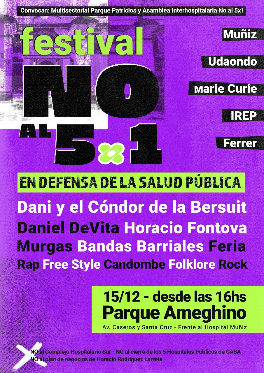 Mañana los trabajadores y trabajadoras de diferentes hospitales participarán de un festival en el parque Ameghino oponiéndose al “Complejo Polivalente Hospitalario Sur” que Rodríguez Larreta pretende imponer, planificando para ello el cierre de los hospitales Marie Curie, Ferrer, Udaondo, IREP y Muñiz con el objetivo de transformarlos en institutos .