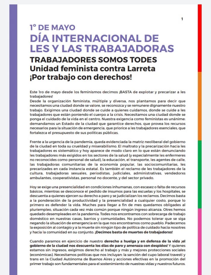 "Las y les trabajadores feministas, múltiple y diversa, de CABA nos plantamos para decir que necesitamos una ciudad donde se valore la vida. Como trabajadoras y trabajadores feministas exigimos y demandamos un Estado de la ciudad que garantice derechos, que provea los recursos necesarios para la situación de emergencia, que priorice a les trabajadores esenciales, que fortalezca el presupuesto de sus políticas públicas, que se garantice la virtualidad", reclaman las organizaciones feministas que también tuvieron una activa participación en las redes sociales mediante la difusión de hashtags como