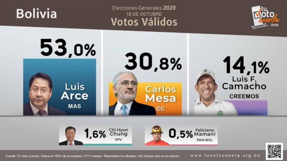 Según señaló un conteo rápido de la encuestadora Ciesmori para medios privados de Bolivia el candidato Movimiento Al Socialismo habría obtenido un 52,4% de los votos frente al 31,5% de Carlos Mesa.